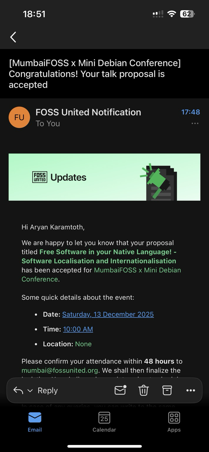 Just received the confirmation of my talk at MiniDebConf Navi Mumbai 2025. Already in the process of making the presentation material, should be done in a few days if exams don't bother me too much